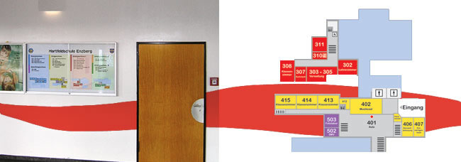 Création et réalisation d’un plan signalétique pour une école de quatre étages à Enzberg (Allemagne). Impression numérique sur aluminium 86 × 156 cm. Maître d'oeuvre : Ville de Mühlacker, Enzkreis